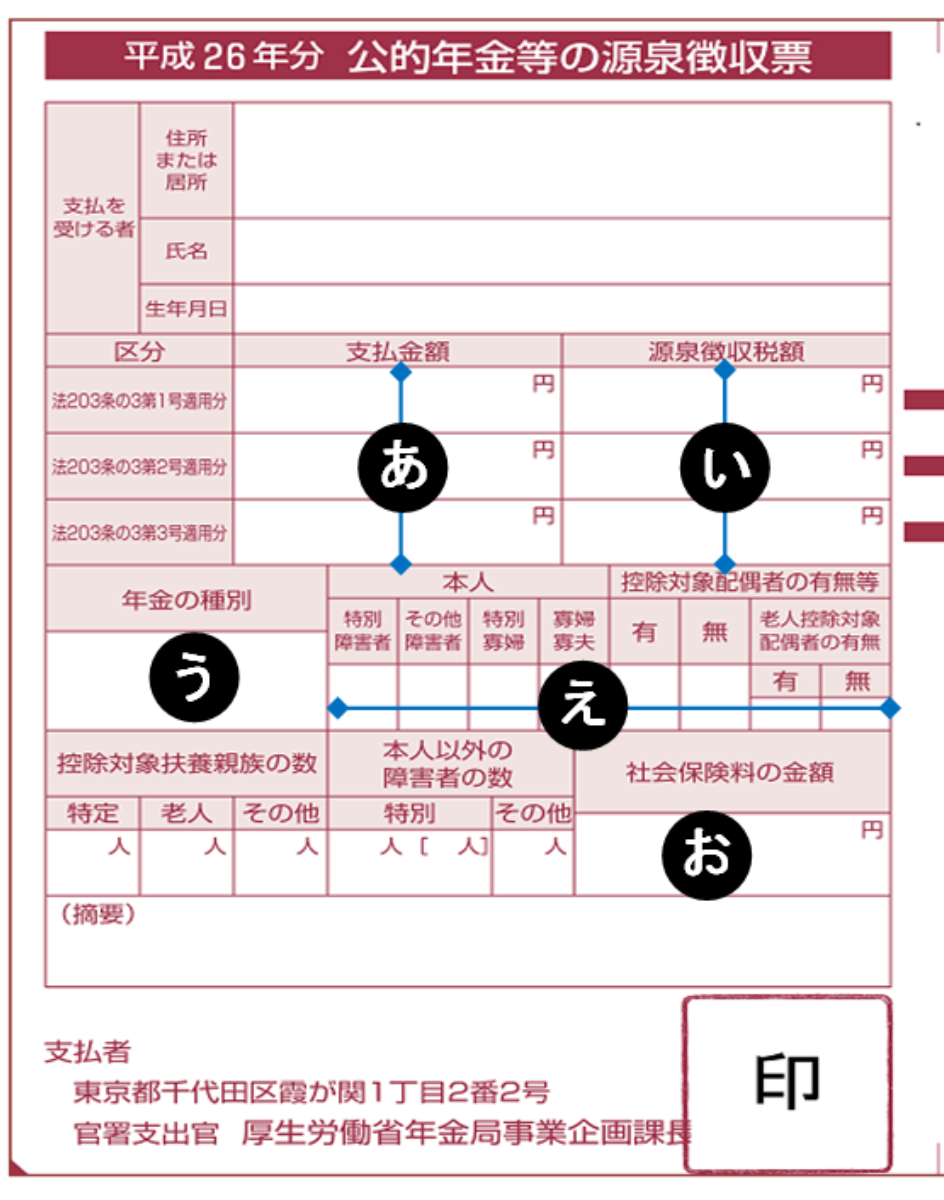 ①公的年金等の源泉徴収票に記載されている社会保険料の金額の合計額(他に払っている社会保険料がある時はそれも加算)