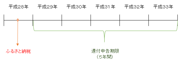 つまり、平成28年にふるさと納税した方の還付申告期限は平成29年1月1日から平成33年12月31日までとなるのです。