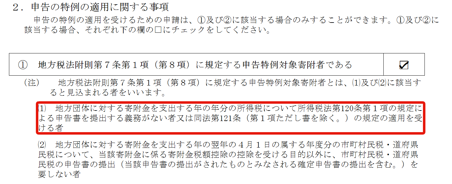 ワンストップ特例申請書の中段辺りにこのような文言のチェック項目があると思います。